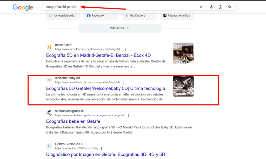 Local pack de uno de nuestros clientes aparece de primero para la búsqueda de “ecografías 5d getafe” ( palabra clave que tiene búsquedas mensuales ).